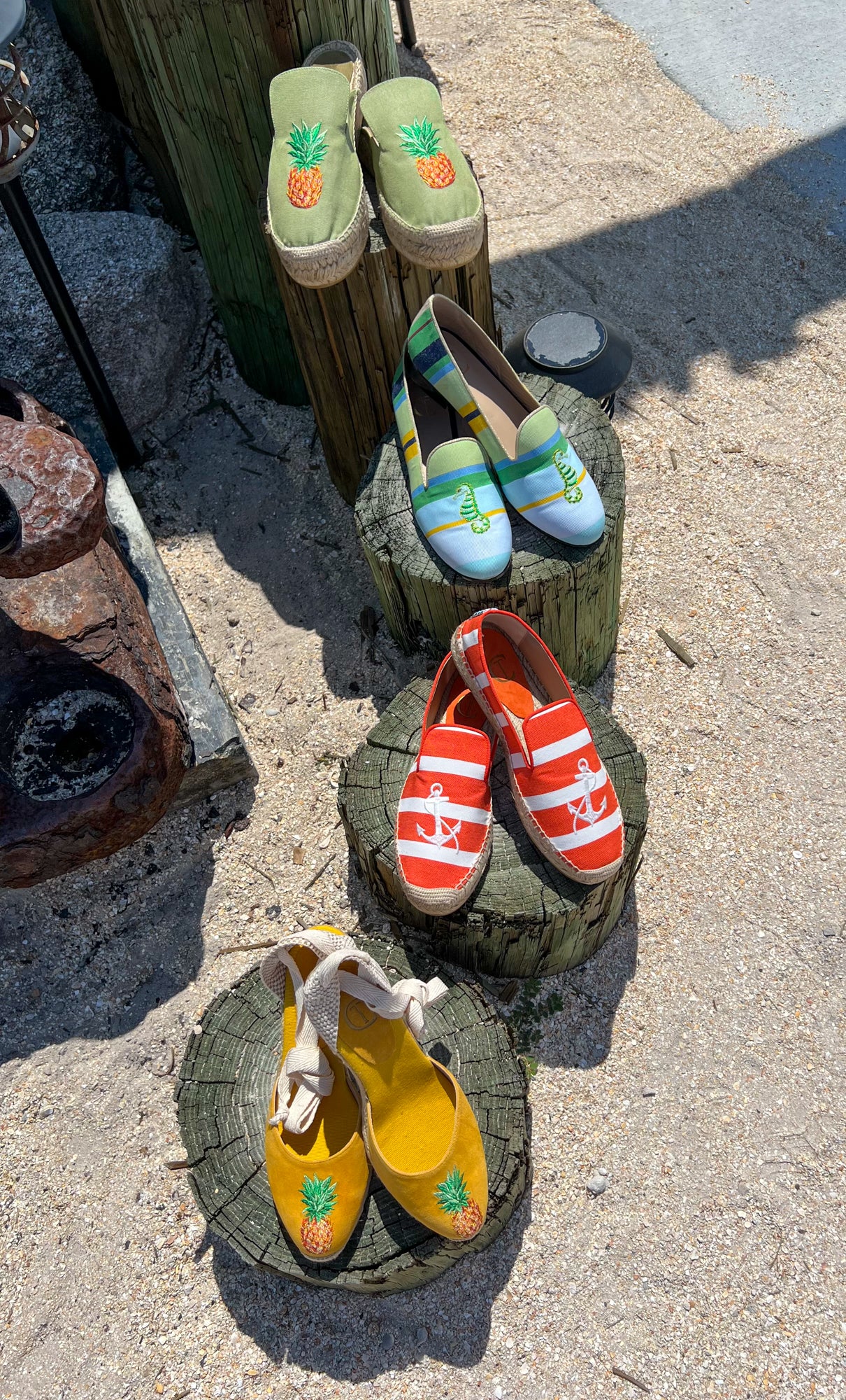 Start your day with our Pineapple Mule Espadrille for the beach day. Or our Seahorse Slippers to go shopping around town. Later for lunch and afternoon our Anchor Espadrilles will keep you comfortable. Get ready for the night with our Pineapple Wedges.